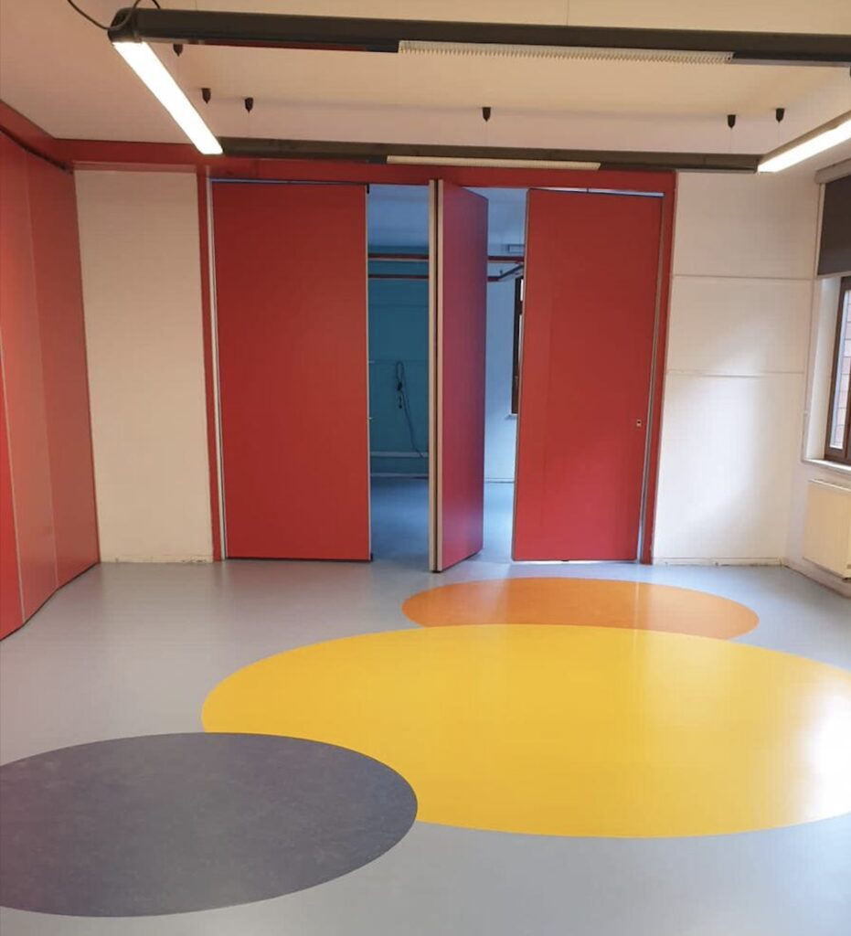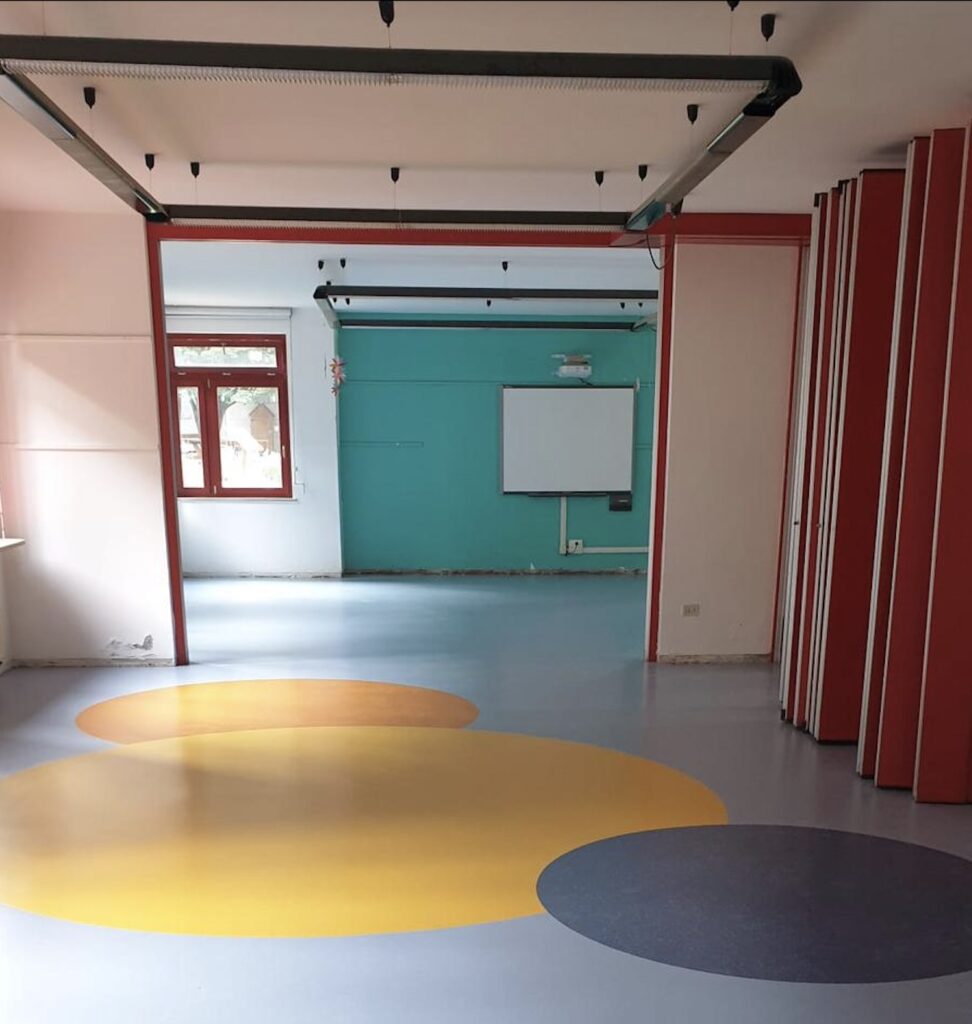 Nel pavimento delle interaule sono stati inseriti dei cerchi colorati per le attività in gruppo.