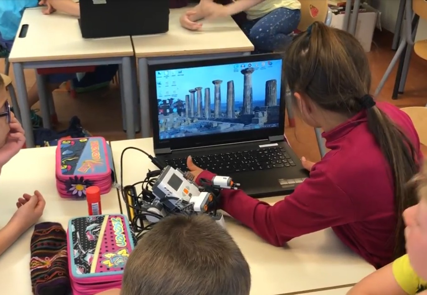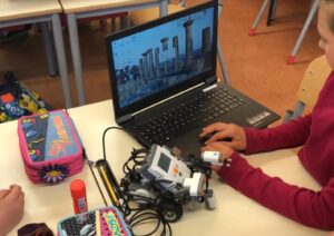 In classe noi alunni programmiamo i robot, Lego Mindstorms EV3. Coi nostri programmi i robot possono fare autonomamente alcune cose come per esempio parlare, suonare delle musiche, muoversi, riconoscere e superare degli ostacoli.