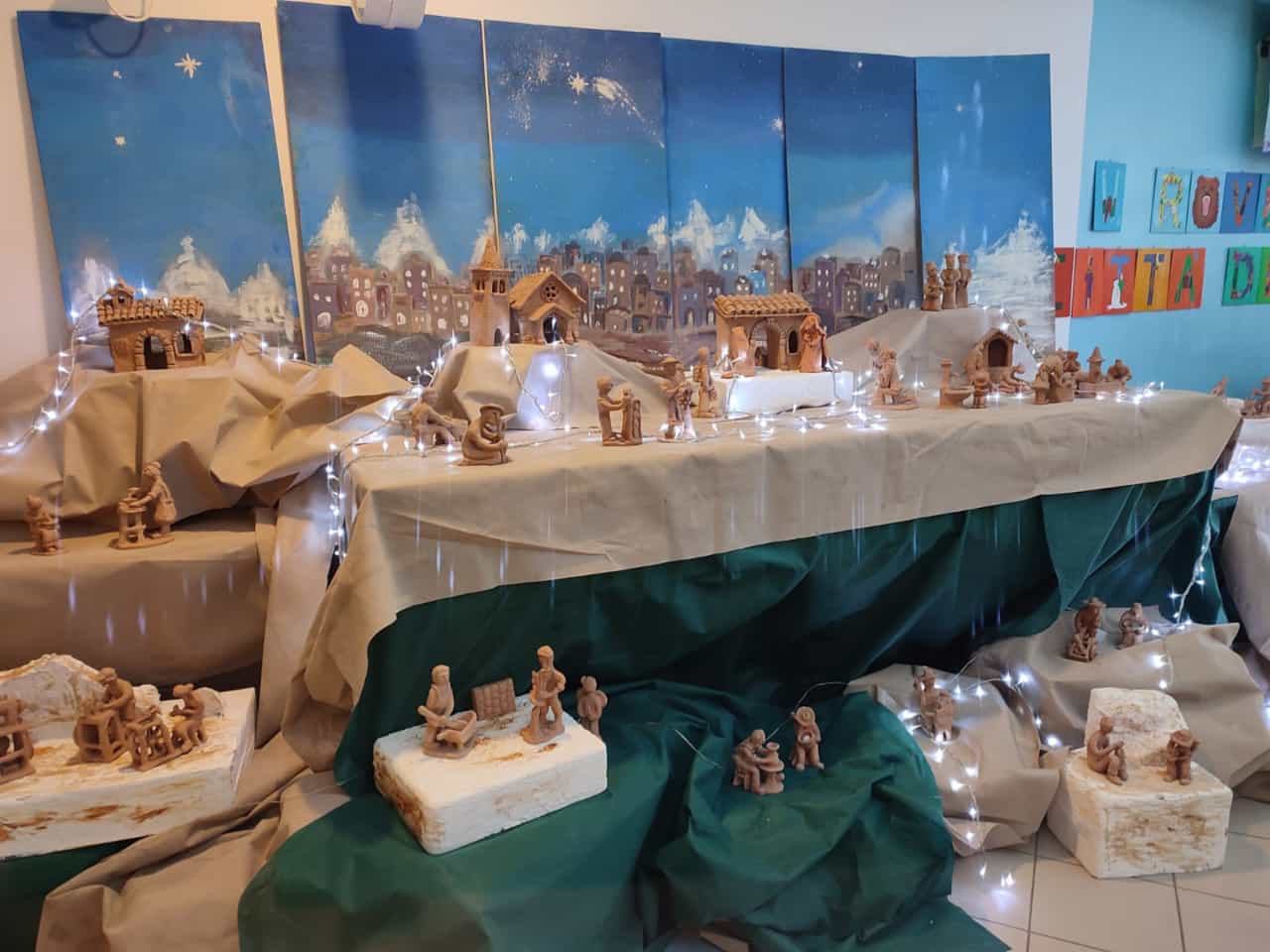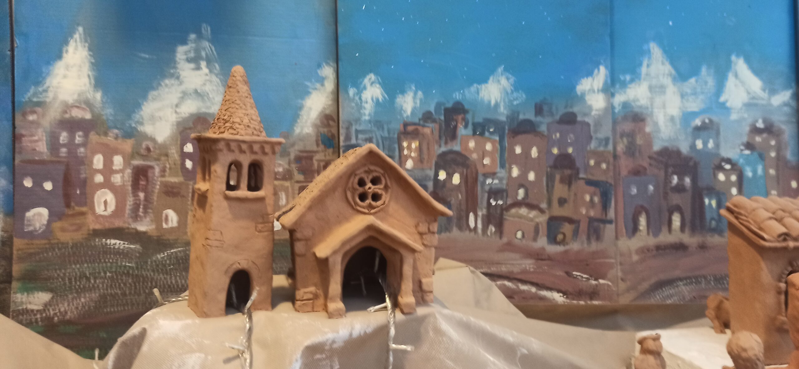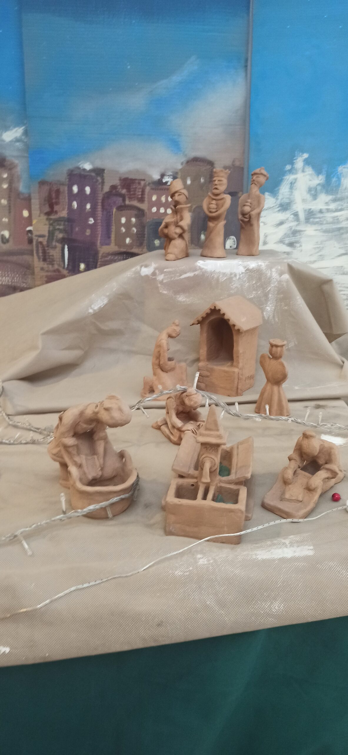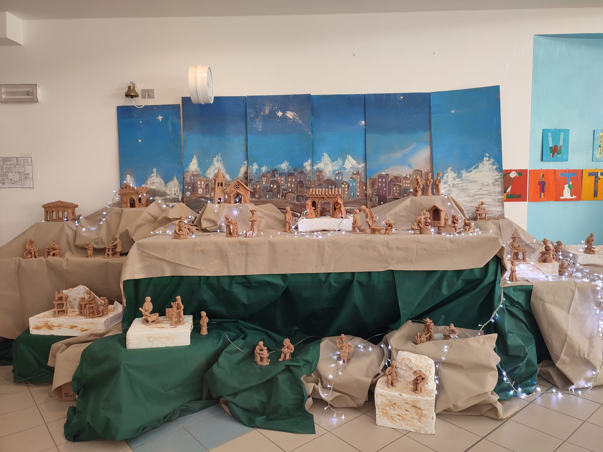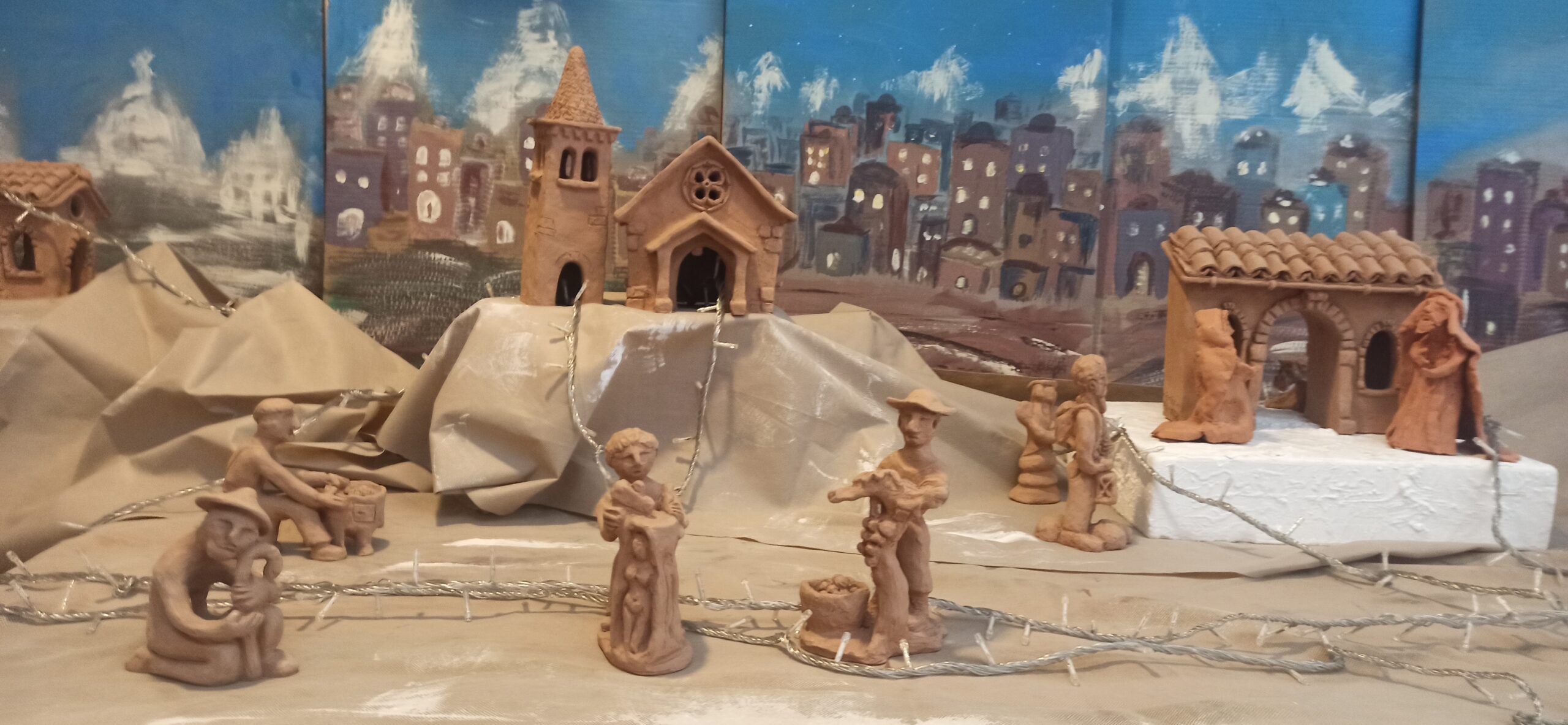Una particolarità di questo Presepe è che ogni anno cambia il suo “cielo”. Quest’anno un gruppetto di ragazzi della IIE, guidati dalla prof.ssa Loredana Russo, ha dipinto uno sfondo dove risalta un’antica città dall’aspetto orientale, con abitazioni abbarbicate e illuminate da una luce delicata e fievole che riesce a rendere l’ambiente più caldo e affascinante. Alle spalle sbucano imponenti montagne innevate che si stagliano verso il cielo che volge al crepuscolo.