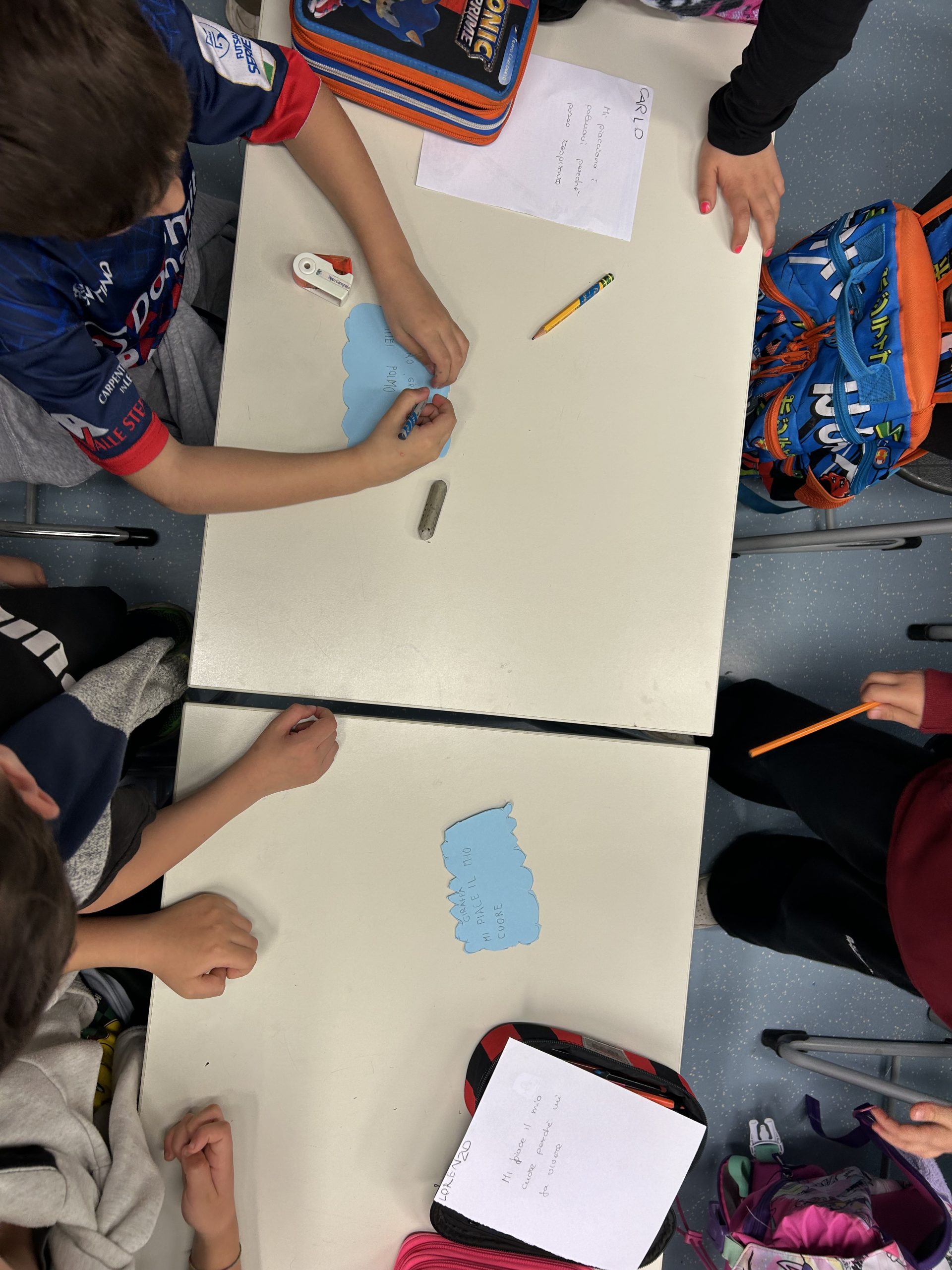 Prima di tutto, ho spiegato ai bambini di prima l’importanza di questo progetto. Poi, nella nostra Agorà (il nostro spazio comune), abbiamo letto loro “Il Leone che non sapeva scrivere”. Ogni bambino ha ricevuto un cartoncino azzurro per disegnare e ritagliare una grande nuvoletta, che sarebbe stata preziosa per il primo incontro.