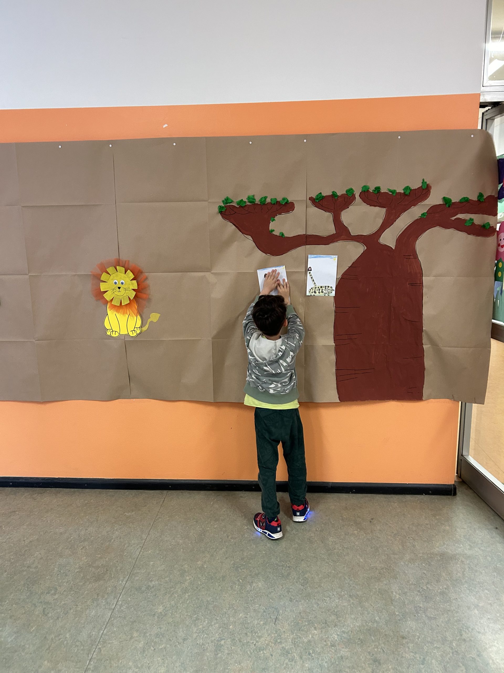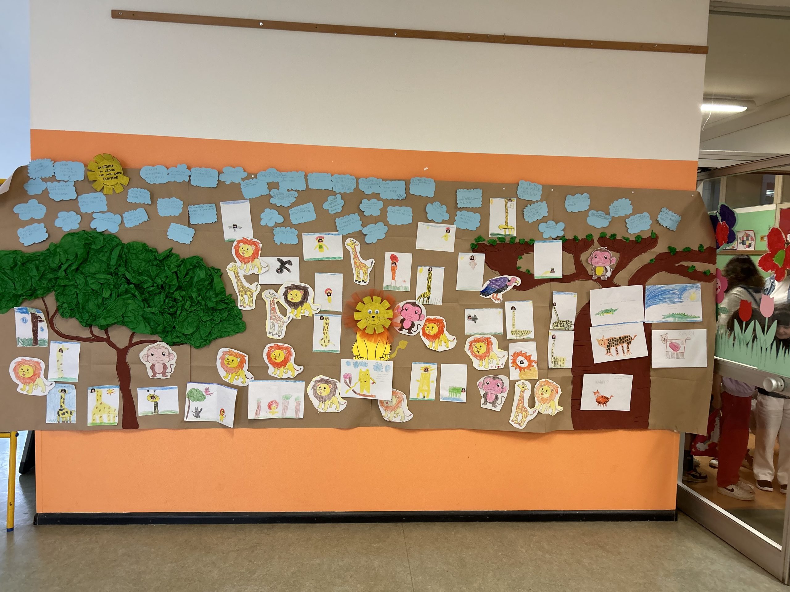 Il giorno della “continuità”, dopo i saluti nella nostra Agorà, il libro è stato riproposto ai piccoli amici dell’infanzia. I bambini sono stati divisi in due gruppi e hanno svolto un laboratorio nelle aule. Che emozione per i bambini di cinque anni sedersi al banco dei “grandi” di prima! Hanno mostrato il personaggio della storia che avevano scelto e disegnato, spiegando la loro scelta e la caratteristica che li descriveva meglio. I bambini di prima, poi, hanno scritto la frase del bambino sulla nuvoletta, proprio come gli animali della storia hanno fatto per il leone. Alla fine, ci siamo ritrovati tutti nell’atrio, davanti a un grande cartellone, e ognuno ha appeso il proprio disegno e la propria nuvoletta.